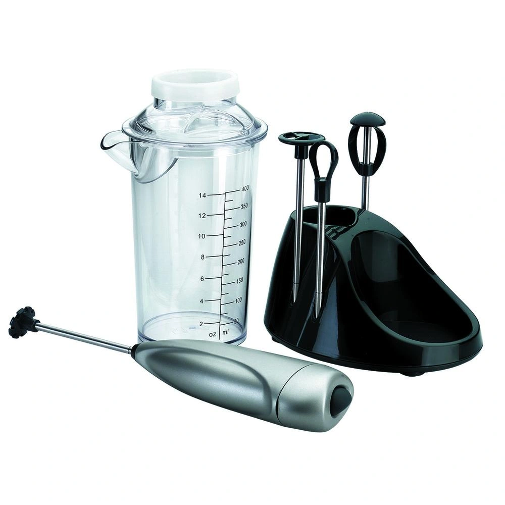 El set incluye un vaso medidor y 4 varillas intercambiables: una varilla agitadora, una varilla para espumar, una batidora y una mezcladora. Con estas varillas, podrás preparar una amplia variedad de bebidas con diferentes texturas y consistencias, adaptándose a tus gustos y preferencias.
