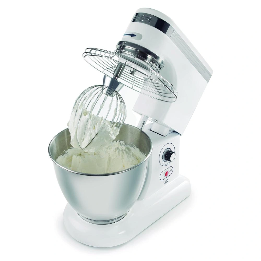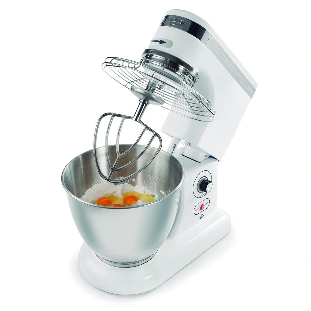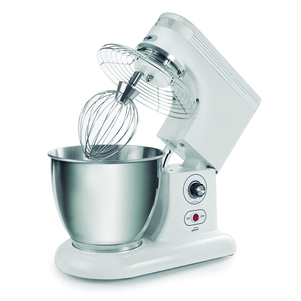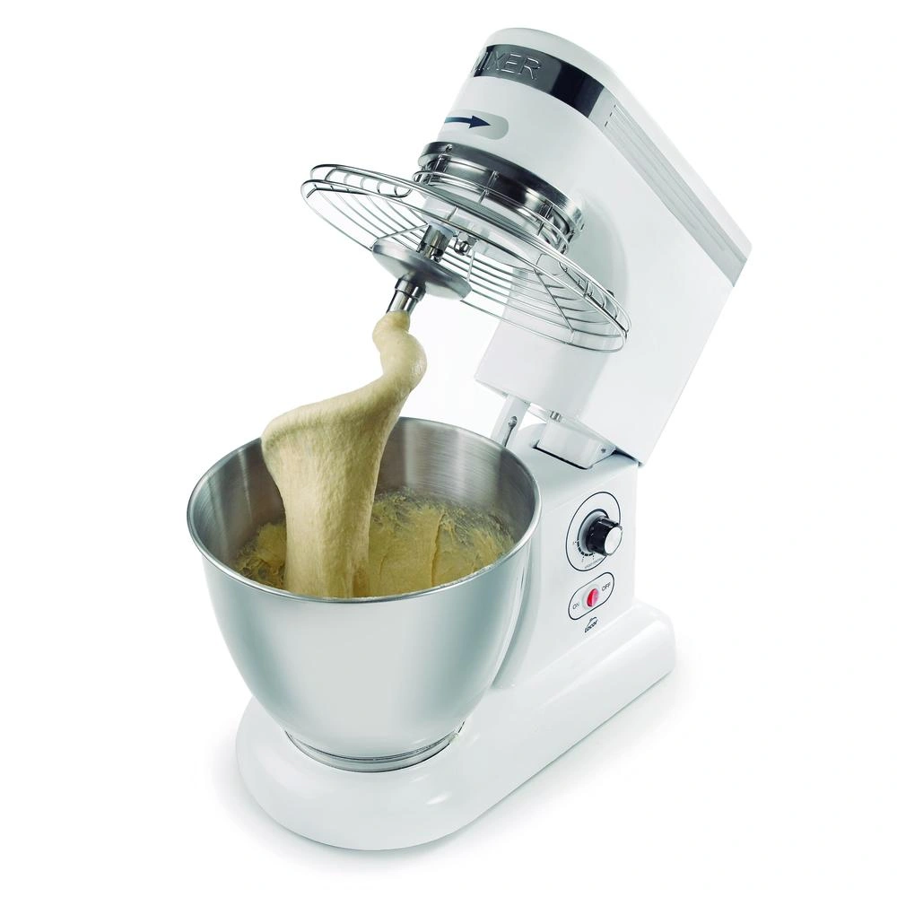 – La batidora amasadora con bol de 5 litros y 300 W es ideal para batir, mezclar y amasar productos destinados a la preparación de alimentos de consumo como masas para panadería, repostería, pizzas y montar natas.