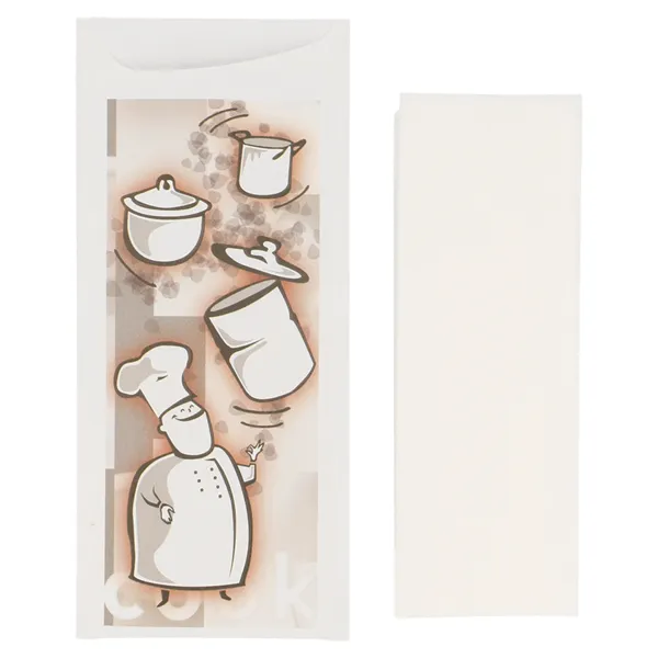 Bolsas cubiertos + servilleta «buen provecho» ‘just in time’ 90 + 10pe g/m2 8,5×19,5 cm blanco airlaid
