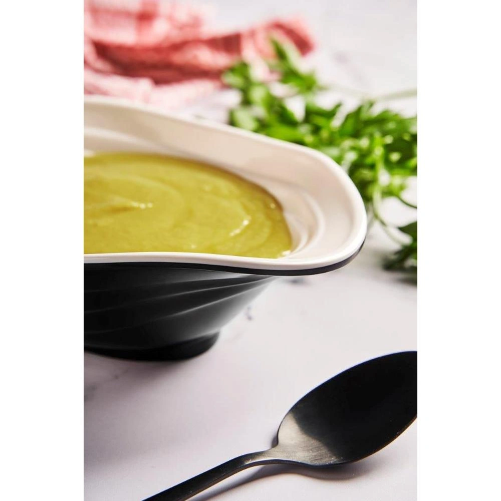 Fabricada en melamina, esta ensaladera es resistente y duradera, ideal para el uso diario en restaurantes, hoteles o eventos. Con unas medidas de 23x16x7.5 cm y un peso de 276 gramos, es fácil de manejar y transportar. Su diseño bícromo en negro le da un toque elegante y moderno, perfecto para cualquier tipo de decoración o estilo de servicio.
