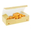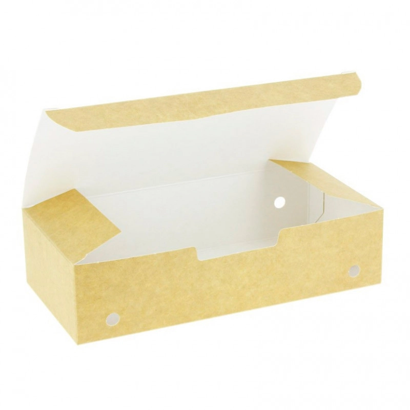 Caja de Comida Pequeña Kraft para fritos fabricadas en cartoncillo. Medida: 23,3×12,7×7 cm. Capacidad: 1400 ml. El grosor es 300g/m2. Caja de 200 uds.