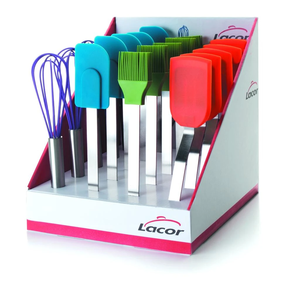 La caja display de 20 piezas de repostería de silicona es el set perfecto para cualquier amante de la repostería. Este set incluye 4 espátulas de silicona redondeadas, 4 espátulas de silicona, 4 pinceles de silicona y 4 batidores manuales con varillas de silicona. Todos los productos son aptos para lavavajillas, lo que los hace fáciles de limpiar y mantener en perfectas condiciones. Además, todos los productos se pueden colgar para un fácil almacenamiento.