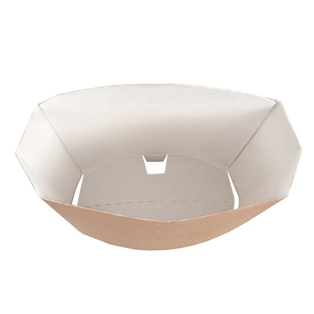 Cajas para patatas fritas y otros entrantes de cartón. Estilo petaca con acabado de kraft marrón es perfecto para combinar con nuestra gama de envases y cajas kraft para hamburguesa y otros productos.