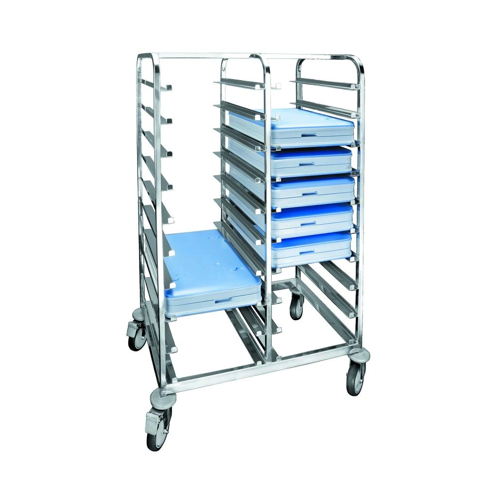Fabricado en aluminio, este carro es liviano pero resistente, lo que lo hace fácil de manejar y duradero. Sus dimensiones son de 620 x 906 x 1481 mm, con un tamaño compatible de bandejas que va desde 308 x 550 x 125 mm hasta 388 x 550 x 125 mm. Esto lo hace versátil para adaptarse a diferentes tamaños de bandejas.