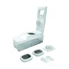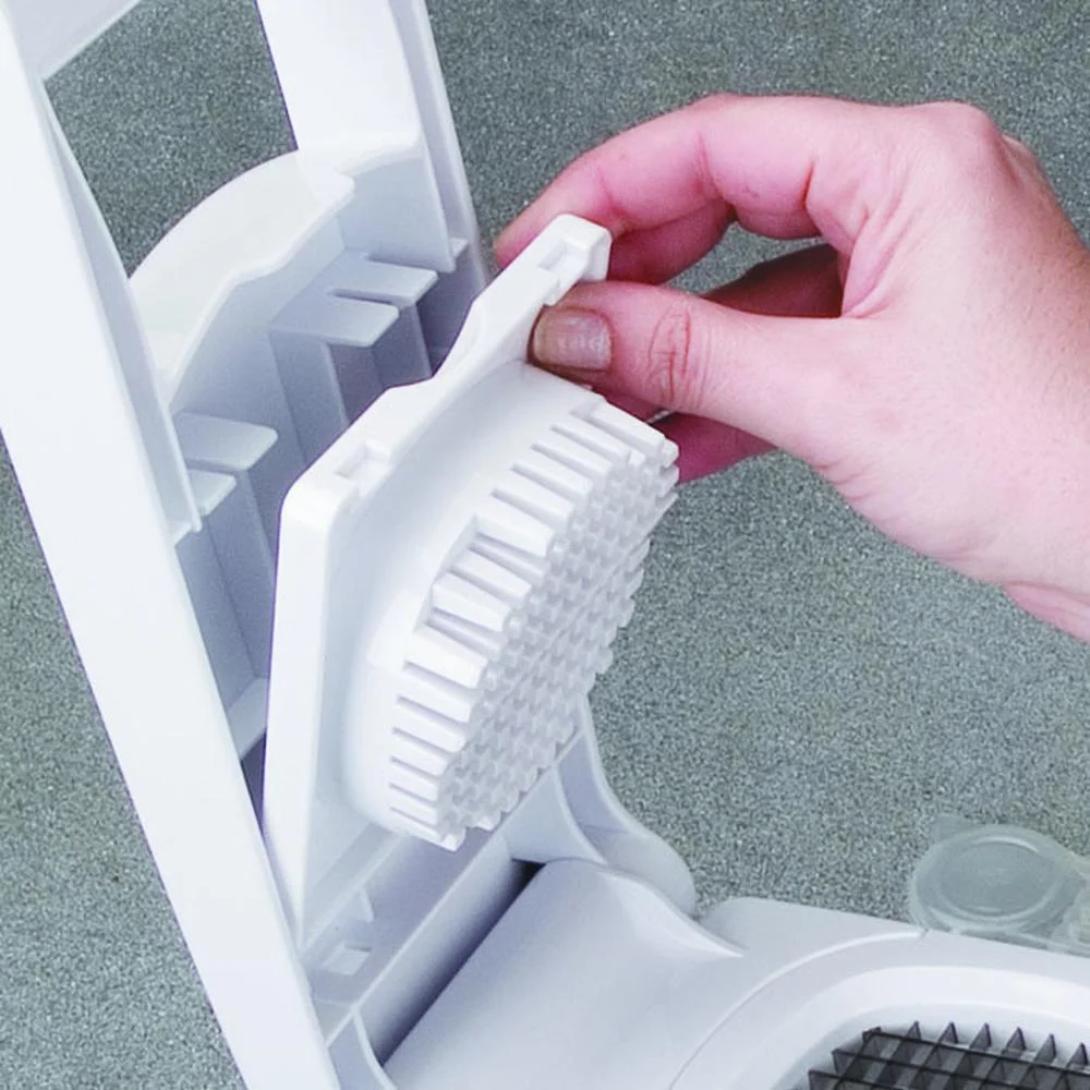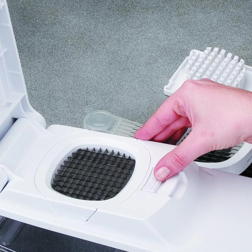 Fabricado con materiales de alta calidad como el plástico resistente y el acero inoxidable, este cortador garantiza durabilidad y eficiencia en su uso. Además, incluye dos peines para retirar los restos de alimentos de las cuchillas y facilitar la limpieza del utensilio.