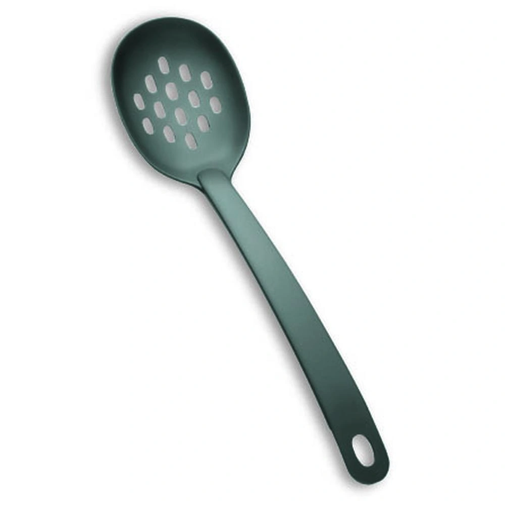 El diseño de la cuchara incluye un mango de 22 cm que facilita su uso y manejo, y cuenta con un agujero en el extremo para que pueda colgarse y almacenarse de forma práctica. Fabricada en nylon de alta calidad, esta cuchara perforada es resistente y duradera, y además es apta para lavavajillas, lo que la hace fácil de limpiar y mantener.