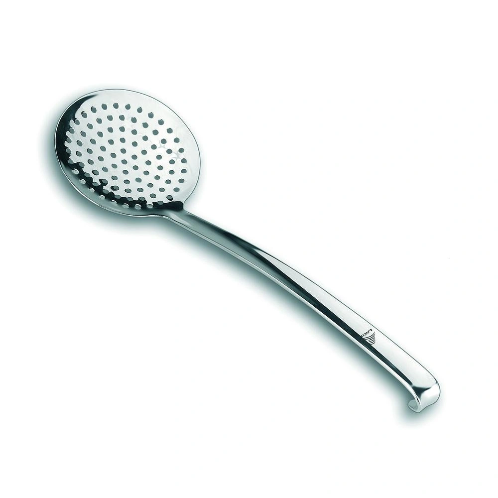 La espumadera profesional es una herramienta de cocina imprescindible para cualquier chef o cocinero aficionado. Con un diámetro de 8,5 cm, esta espumadera está diseñada para extraer la espuma de los líquidos o los fritos directamente de la sartén, permitiendo un filtrado eficiente de los alimentos. Fabricada en una sola pieza de acero inoxidable, garantiza una mayor robustez y durabilidad, incluso en entornos de uso intensivo como cocinas profesionales. Además, su diseño incluye un práctico agujero en el mango para poder colgarla y tenerla siempre a mano.