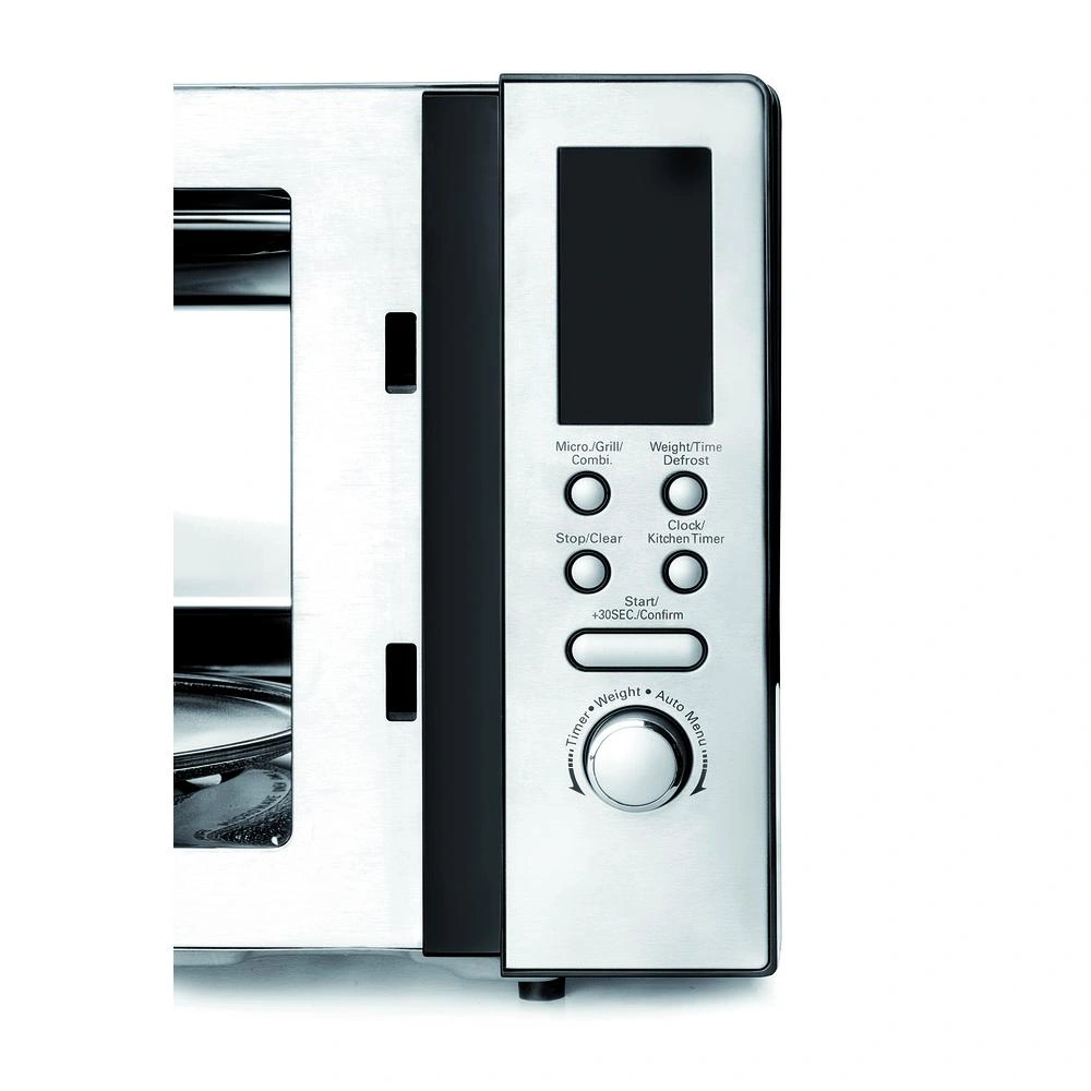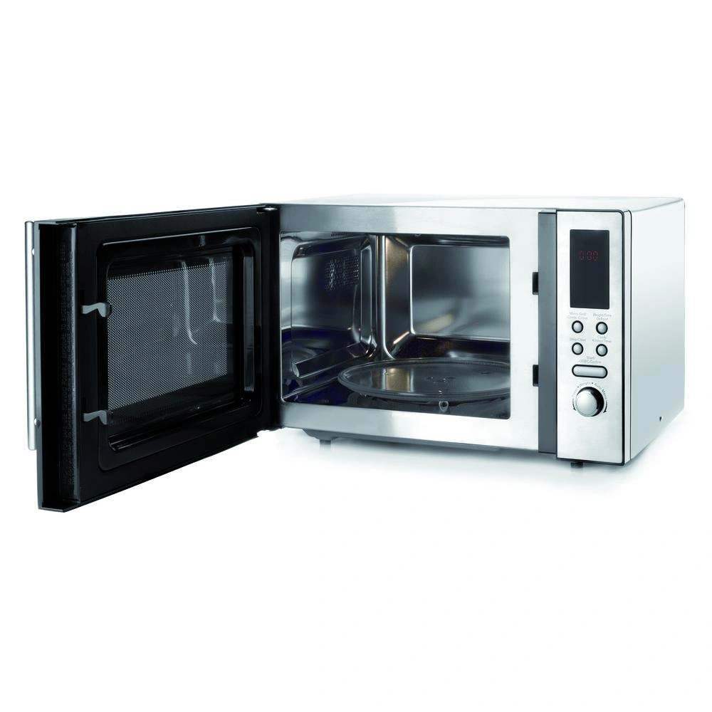 Este horno microondas incluye un plato giratorio de 27 cm y tiene unas medidas interiores de 33 x 32 x 20.5 cm, lo que lo hace ideal para cocinar una gran variedad de platos. Además, su diseño de acero inoxidable le da un aspecto moderno y elegante que se adapta a cualquier cocina.