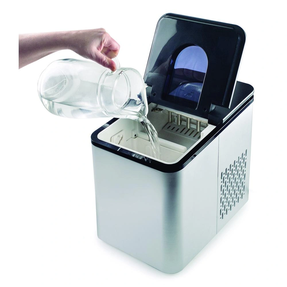 La forma del cubito de hielo es de tipo bala, con un diámetro de 26 mm y una altura de 30 mm. El ciclo de producción es totalmente automático y silencioso, con detección por infrarrojos que detiene automáticamente la máquina al detectar que el contenedor de hielo está lleno. Además, cuenta con una alarma acústica que avisa cuando el compartimento de hielo está lleno o si se necesita más agua.