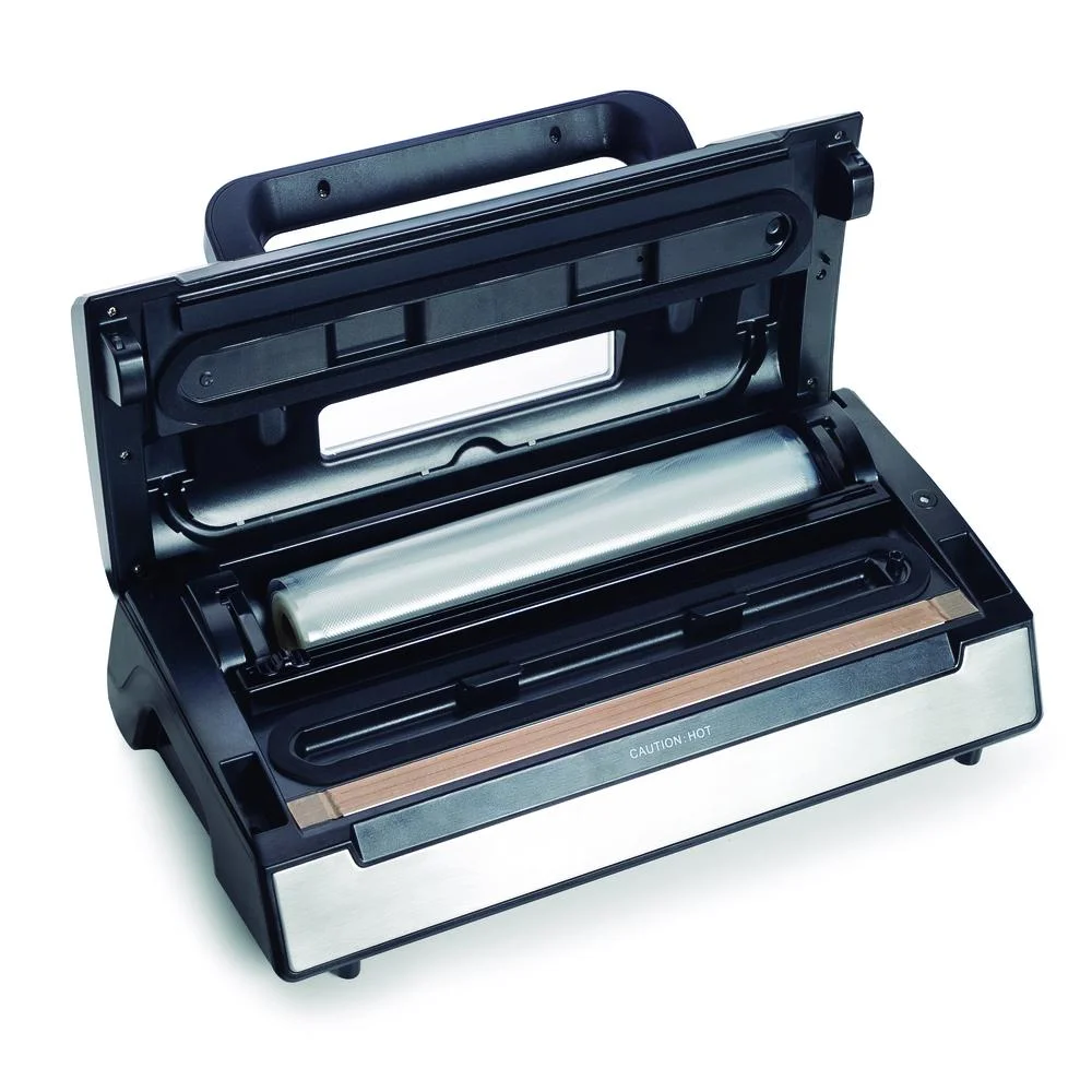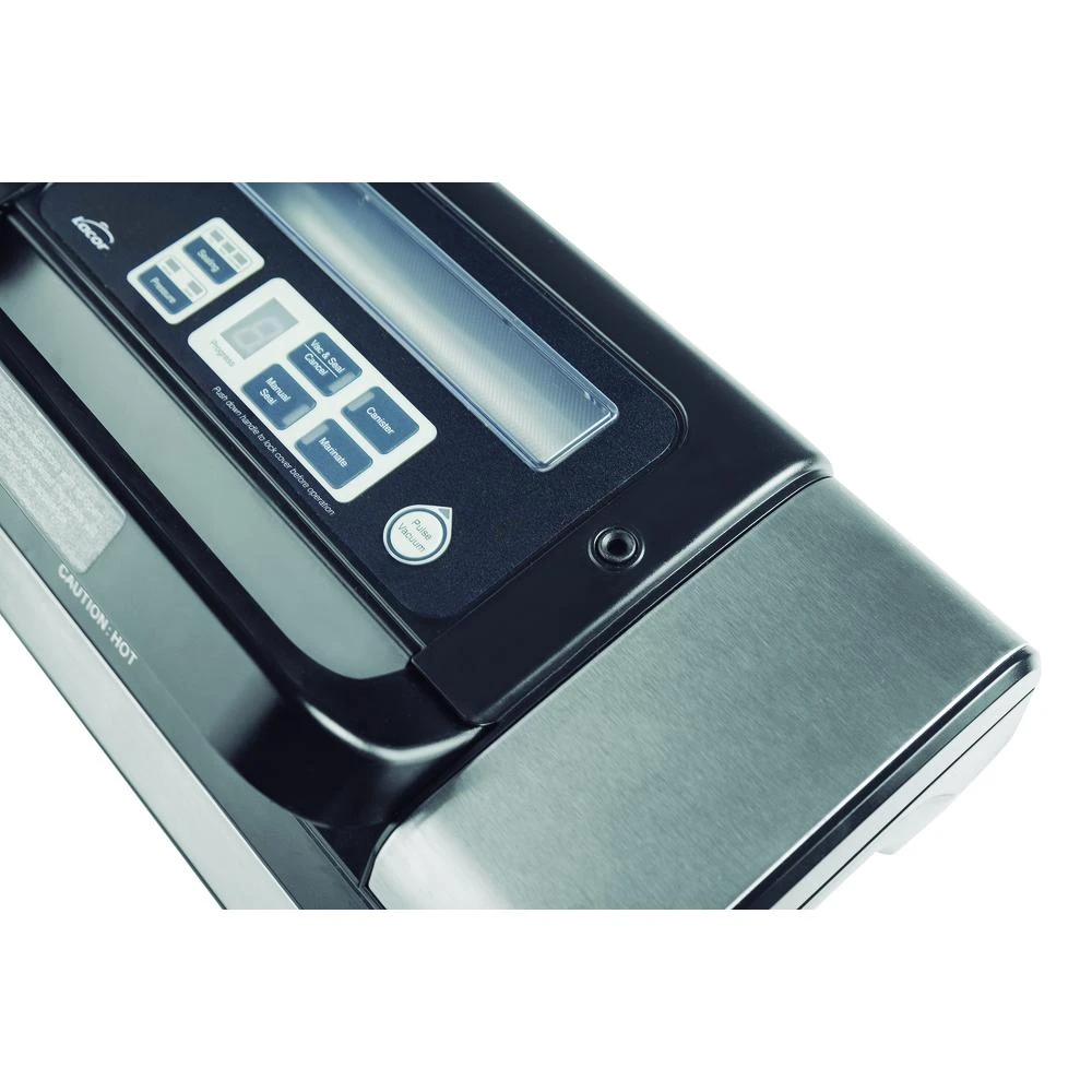 La máquina de vacío Efficient es ideal para conservar alimentos sólidos, carnes, pescados, embutidos, legumbres y verduras frescas o cocinadas. Cuenta con una doble bomba de vacío potente que garantiza un vacío óptimo, un ciclo de envasado automático, 2 niveles de presión automáticos, función MARINATE para marinados al vacío, función PULSE para alimentos frágiles, 3 niveles de tiempo de sellado, doble banda de sellado de 2 mm de ancho y carcasa de acero inoxidable. Incluye un compartimento para rollo de 28 cm x 5 m con barra para corte instantáneo y un orificio para aspiración de botes. Con garantía de 24 meses, pesa 2.7 Kg y tiene dimensiones de 40 x 21 x 11.7 cm. Con potencia de 130 W, tensión de 220-240 V, frecuencia de 50 Hz, longitud de cable de 128 cm, anchura máxima de sellado de 30 cm, caudal de bomba de vacío de 20 L/min, 2 niveles de presión, 0.9 Bar de presión y sellado CE, EMC, RoHS, LVD. También cuenta con repuestos disponibles.