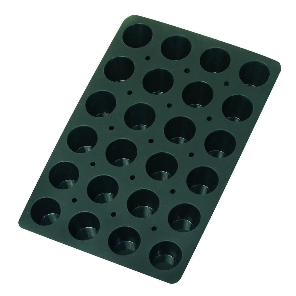 La silicona de estos moldes es antiadherente y flexible, lo que permite desmoldar fácilmente los productos horneados. Se deben lavar a mano o en lavavajillas después de cada uso. El molde para muffins cuenta con 24 cavidades, con medidas de Ø 69 mm x 39 mm de profundidad y capacidad de 122 ml.