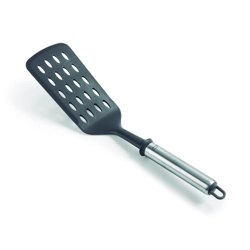 La paleta de pescado DUE es el utensilio perfecto para cocinar y servir pescado de manera elegante y funcional. Fabricada en Nylon de alta calidad, esta paleta no rayará el antiadherente de tus sartenes durante el cocinado, garantizando la durabilidad de tus utensilios de cocina. Su diseño ergonómico la hace cómoda de usar, y su mango de acero inoxidable 18/10 le da un toque de elegancia.