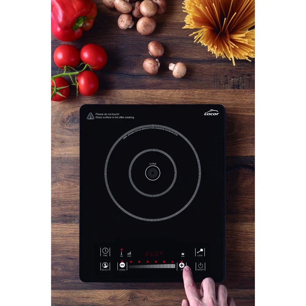 La placa vitrocerámica VITRO es la solución perfecta para cocinar de forma rápida, segura y eficiente en cualquier lugar. Con una potencia de 2000W y una amplia área de cocción de 10 cm / 20 cm de diámetro, esta placa ofrece un calentamiento rápido y uniforme para todo tipo de recipientes.