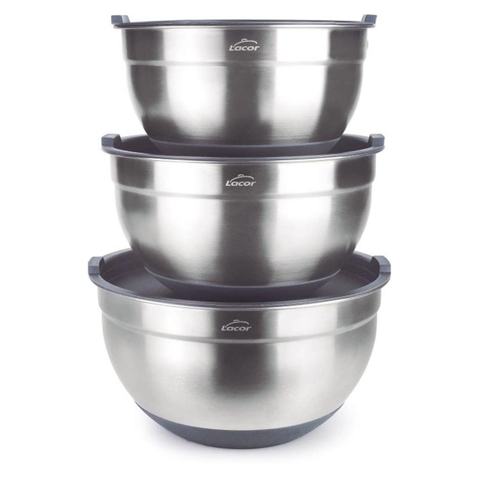 Este set de 3 boles antideslizantes de 20, 22 y 24 cm de diámetro está diseñado para brindar versatilidad en la cocina. Fabricados con acero inoxidable de máxima calidad, cuentan con un acabado satinado tanto en el interior como en el exterior. Son ideales para mezclar, batir, preparar masas y servir ensaladas o salsas, además de ser perfectos para almacenar y conservar alimentos.