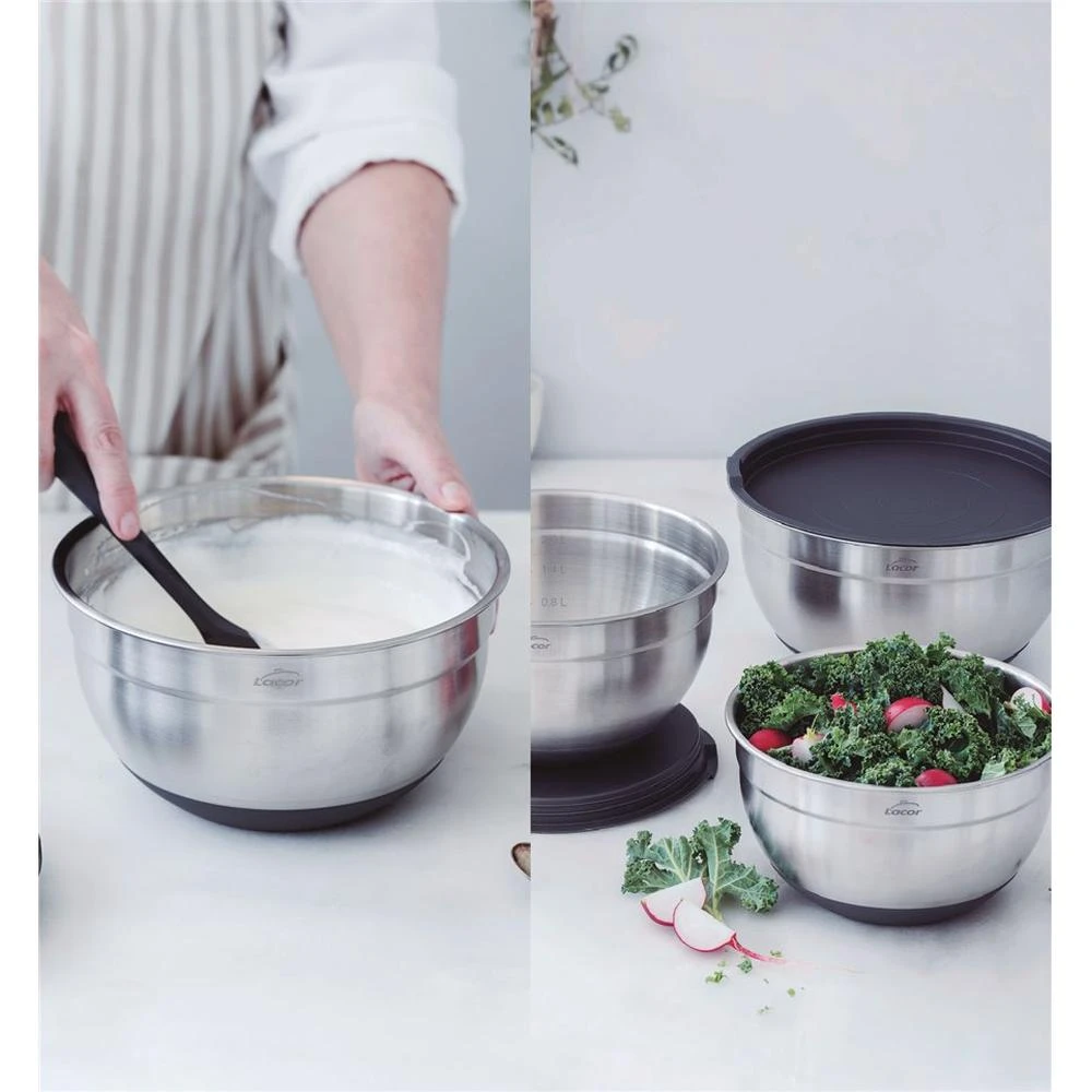 Cada bol cuenta con un marcador de capacidad en el interior, facilitando la medición de ingredientes. Con una altura de 12,5 cm, 13,5 cm y 14 cm respectivamente, estos boles son fáciles de limpiar, aunque no son aptos para lavavajillas.