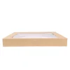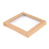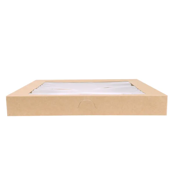 Tapas de cartón kraft natural con ventana transparente, perfectas para tapar cajas de comida y resaltar la presentación y frescura de los alimentos. Ideales para catering y servicios de entrega en restaurantes. Estas tapas permiten visualizar los alimentos sin abrir la caja, añadiendo originalidad y atractivo a su negocio sin perder los detalles clave del producto.