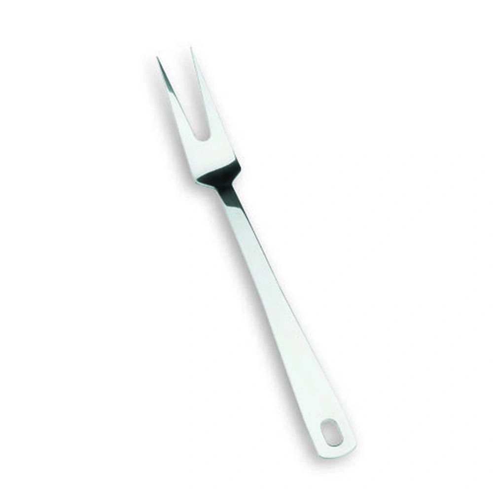 El tenedor de trinchar de acero inoxidable es el utensilio perfecto para cortar y servir asados, carnes y aves. Sus dos dientes están diseñados para sujetar la carne de forma segura y firme, evitando que se resbale o se dañe durante el corte. Fabricado en una sola pieza de acero inoxidable 18/10, este tenedor es extremadamente robusto y resistente, lo que lo hace ideal para uso profesional en restaurantes o cocinas comerciales.