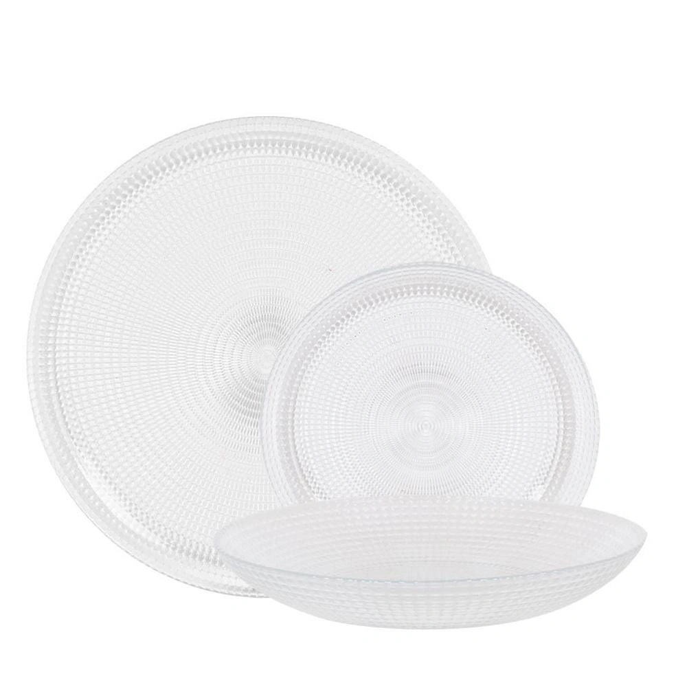 Este set de vajilla incluye 6 platos llanos de 215 cm, 6 platos hondos de 265 cm y 6 platos de postre de 19 cm, ofreciendo una variedad de opciones para servir tus comidas favoritas. Fabricada con vidrio de alta calidad, esta vajilla es resistente y duradera, lo que la hace perfecta para el uso diario. Además, su diseño atemporal y elegante la convierte en una adición imprescindible para cualquier hogar u establecimiento de hostelería.